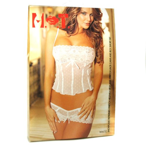 SNOWFLAKE PATTERNED STRETCH HELENKA MESH AND STRETCH LACE 2 PC PJ SET With TRI-TOP that has a halter tie neck and back and a SKIRT with an attached G-string. Colors: Black, White. One Size. (Each color comes packaged in its own box.)